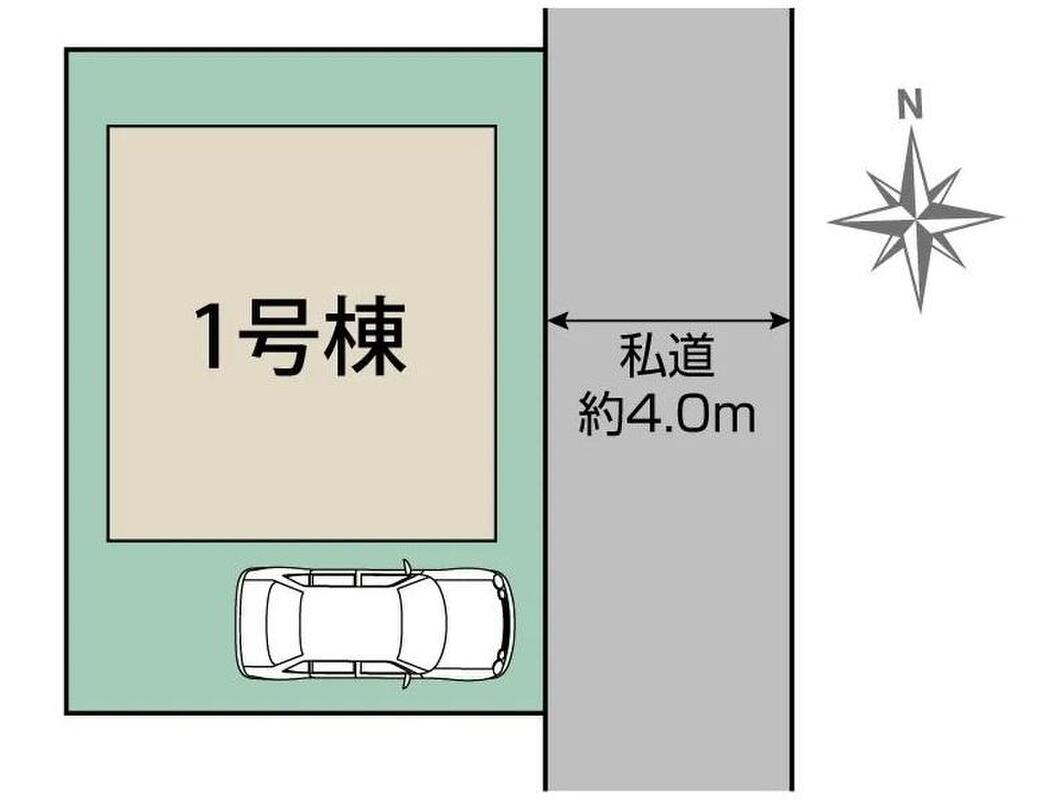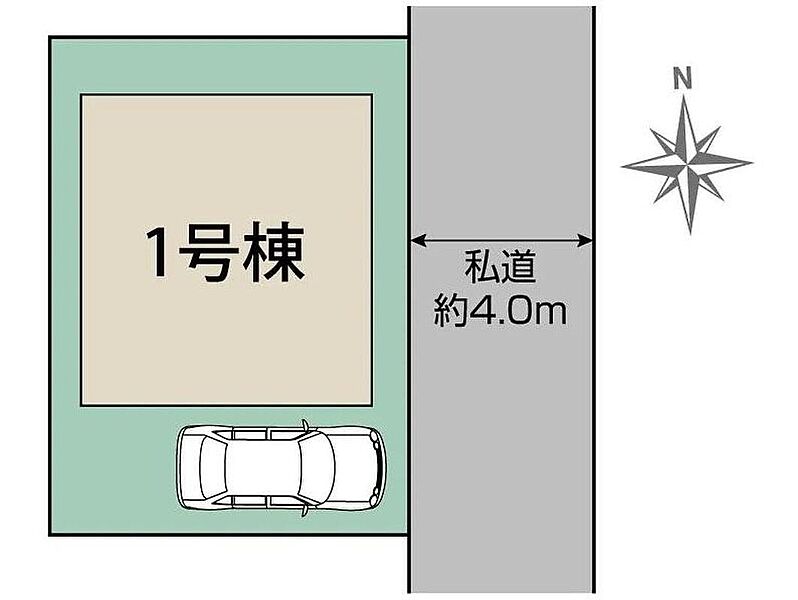 | 駐車場 | 1台 | 道路の幅員 | 道路幅:4m、アスファルト舗装、東側4.0m私道(私道持分17m2×1/1) |