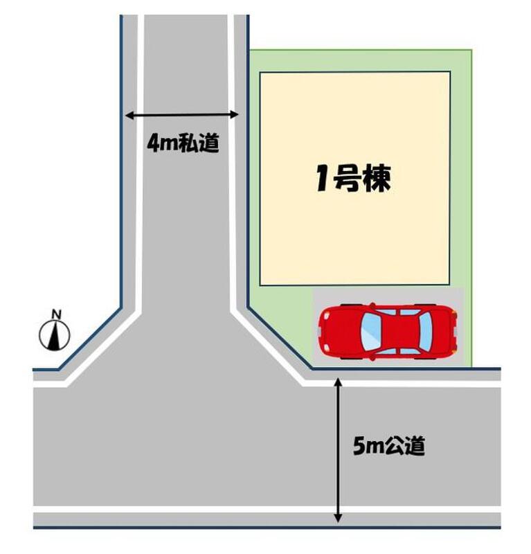 | 駐車場 | 1台(※車種による) | 道路の幅員 | 道路幅:4m~5m、アスファルト舗装、西側4m私道 |
