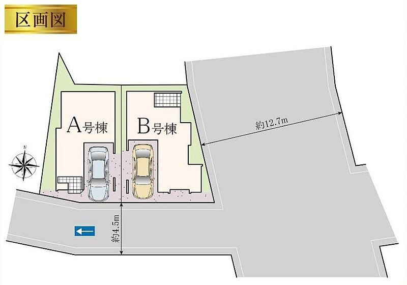 - 道路幅:4.5m~12.7m、インターロック舗装、(B号棟)角地 : 東 12.74m 公道、南 4.54m 公道
