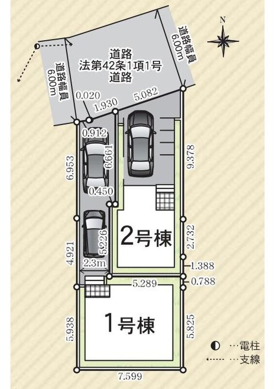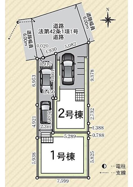 | 駐車場 | 1台 ~ 2台(1号棟(2台)・2号棟(1台)※車種による) | 道路の幅員 | 道路幅:6m、アスファルト舗装 |