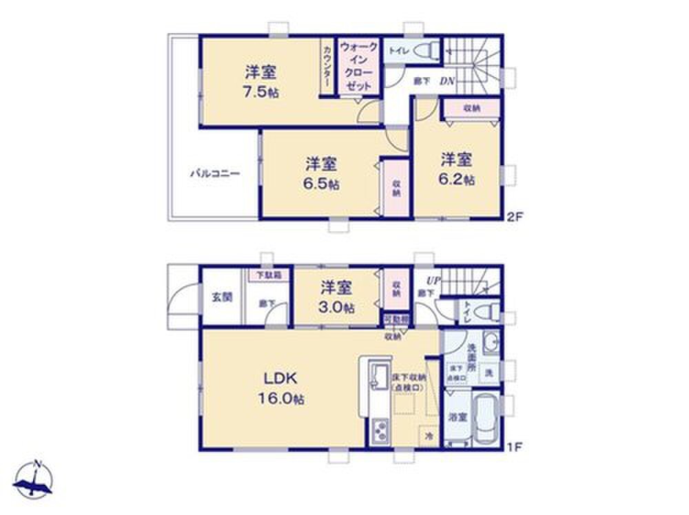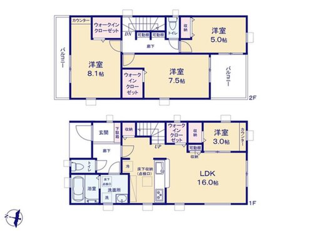 ウォークインクローゼットや各居室に物入完備で収納力抜群