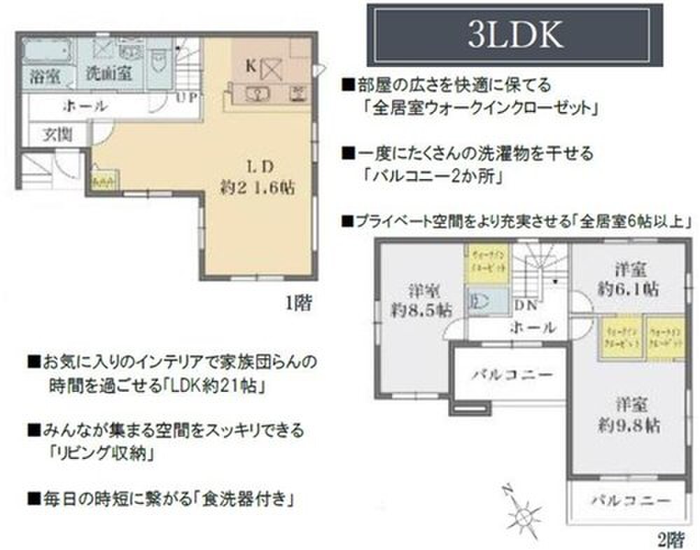 《この物件について》カースペース2台♪広々21.6帖のLDK!対面キッチンからはLDK全体を見渡せます♪2階の洋室は全室6帖以上!ウォークインクローゼット完備でお部屋もスッキリ♪バルコニーが2面!大量の洗濯物も楽々♪