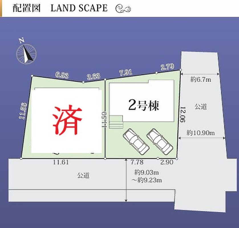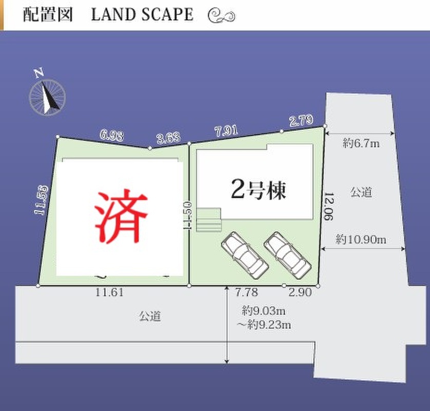 | 駐車場 | 2台 | 道路の幅員 | 道路幅:9m・12m、アスファルト舗装、南側約9.0m公道 東側約12.0m公道 |