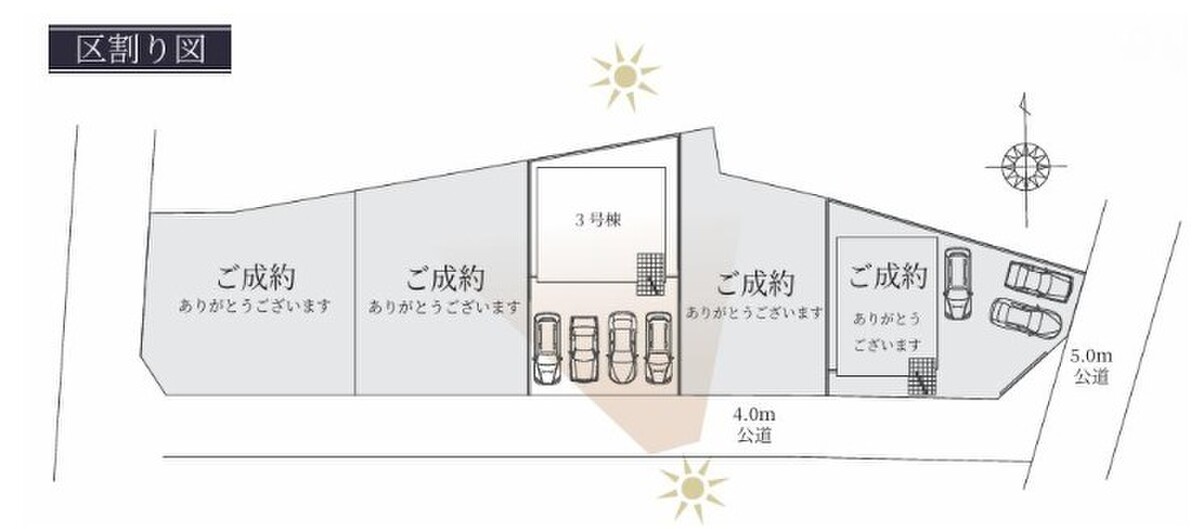 | 駐車場 | 4台(※車種による) | 道路の幅員 | 道路幅:4m・5m、アスファルト舗装、南側約4.0m公道 東側約5.0m公道 |