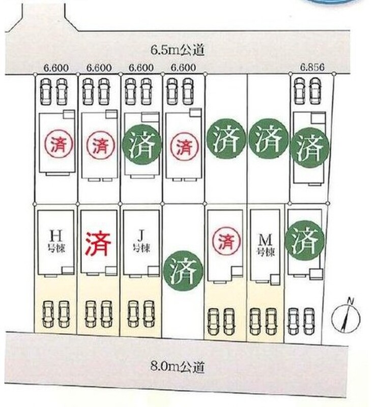 | 駐車場 | 2台 | 道路の幅員 | 道路幅:6.5m・8m、アスファルト舗装、北側約6.5m公道 南側約8m公道 |