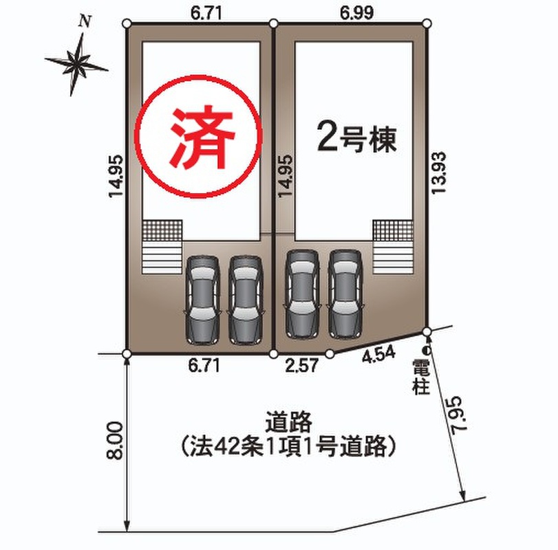 | 駐車場 | 2台 | 道路の幅員 | 道路幅:7.9m、アスファルト舗装、南側7.9m 公道接道 |