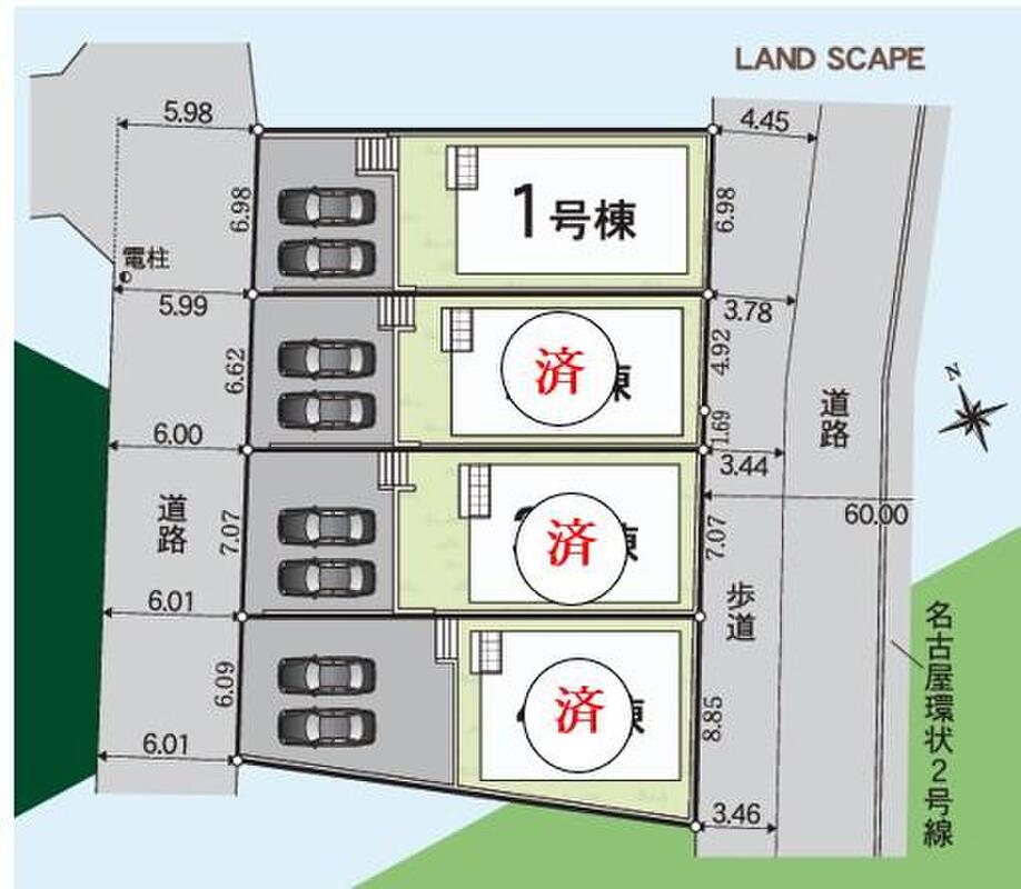 | 駐車場 | 2台 | 道路の幅員 | 道路幅:5.9m・7.9m、アスファルト舗装、東側 約7.95m 公道、西側 約5.98m 公道 |
