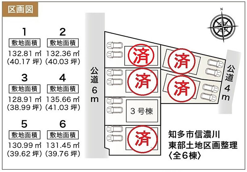| 駐車場 | 2台 | 道路の幅員 | 道路幅:4m・6m、アスファルト舗装、南西側 約6.0m 公道接道(1~4号棟)、他備考欄記載 |