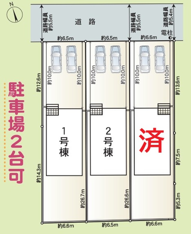 | 駐車場 | 2台 | 道路の幅員 | 道路幅:5.5m、アスファルト舗装、北側 約5.49~5.57m 公道 |
