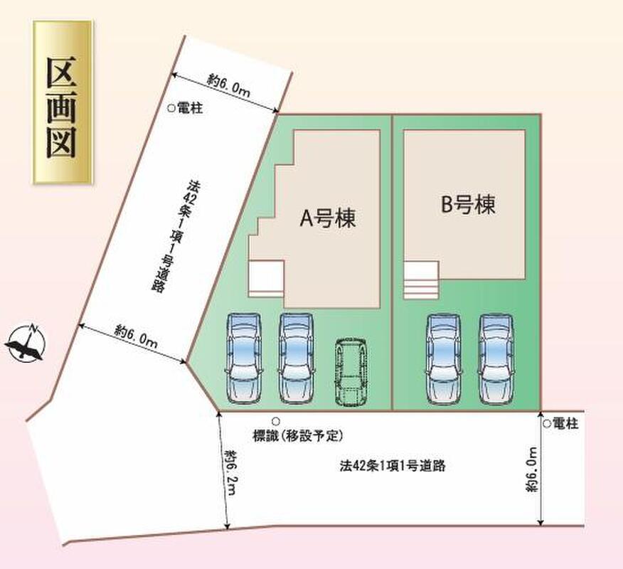 | 駐車場 | 2台 ~ 3台(A号棟(3台 ※車種による)、B号棟(2台)) | 道路の幅員 | 道路幅:6m、アスファルト舗装、南側約6m公道 西側約6m公道 |