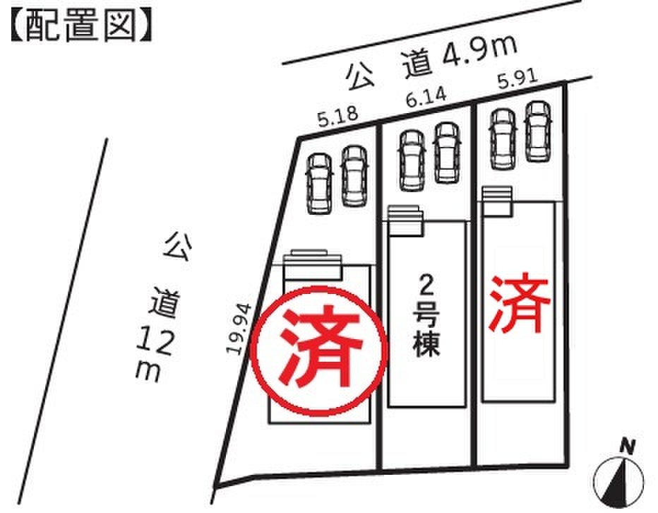 | 駐車場 | 2台 | 道路の幅員 | 道路幅:4.9m・12m、アスファルト舗装、北西側約4.9m 西側約12.0m 公道接道 |