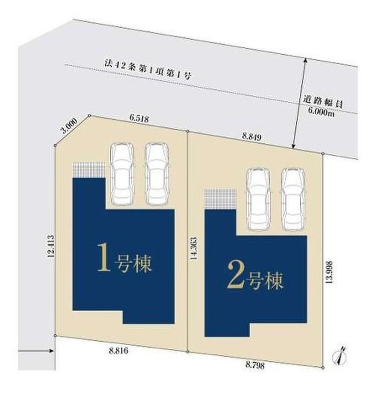 | 駐車場 | 2台 | 道路の幅員 | 道路幅:6m・11m、アスファルト舗装、北側約6m公道 西側約11m公道 |