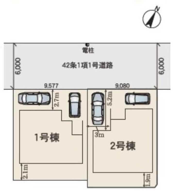 | 駐車場 | 2台 | 道路の幅員 | 道路幅:6m、アスファルト舗装、北側 約6m 市道 |