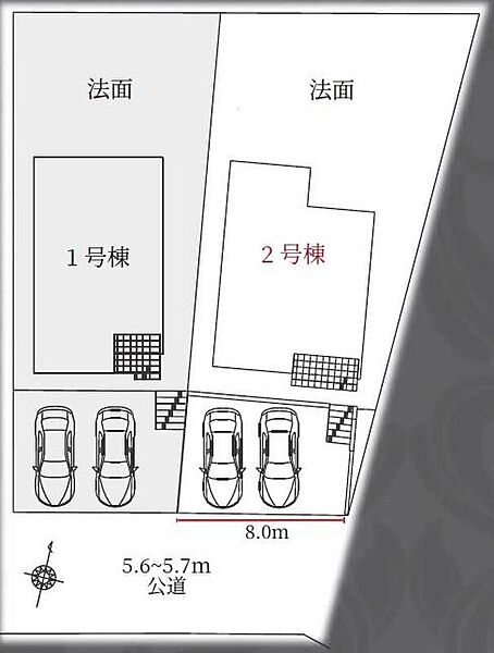 | 駐車場 | 2台 | 道路の幅員 | 道路幅:5.7m、アスファルト舗装、南側 約5.06~5.07m 公道 |