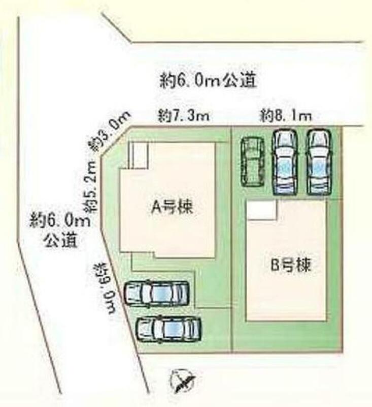 | 駐車場 | 2台 ~ 3台(A棟(2台)・B棟(3台)) | 道路の幅員 | 道路幅:6m、アスファルト舗装、北西側約6.0m公道、北東側約6.0m公道 |