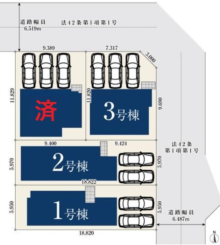 | 駐車場 | 2台 ~ 3台(2台(1・2号棟)、3台(3・4)) | 道路の幅員 | 道路幅:6.5m、アスファルト舗装、北側約6.5m公道 東側約6.5m公道 |