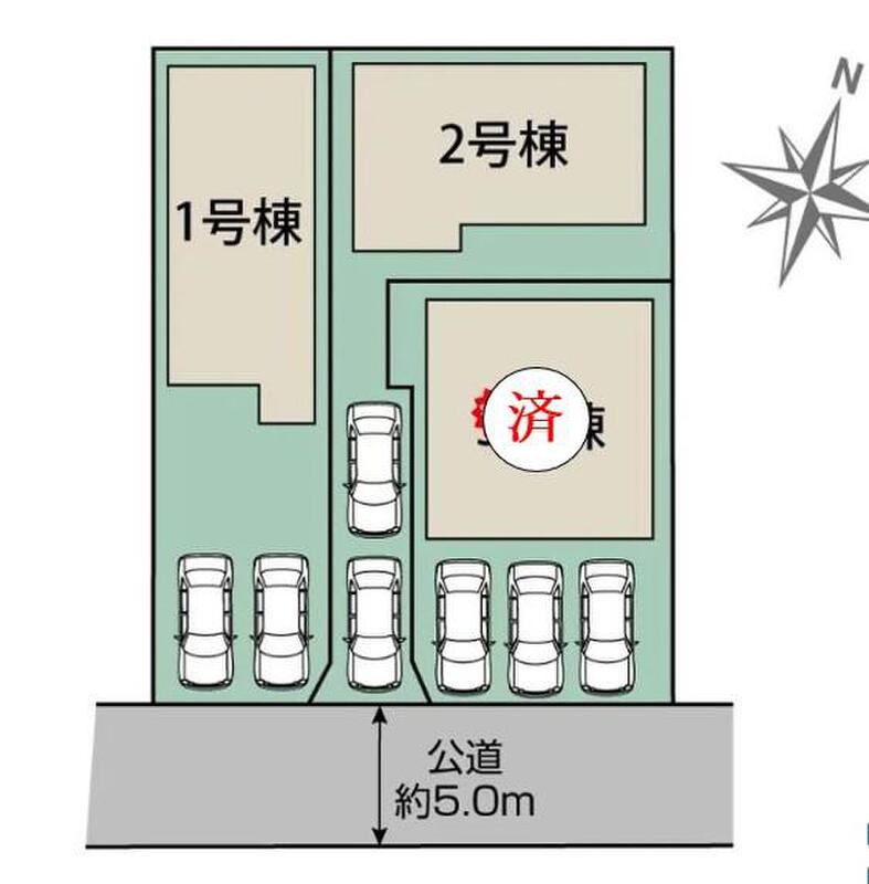 | 駐車場 | 2台 | 道路の幅員 | 道路幅:4.9m、アスファルト舗装、南側 約4.9m 公道 |