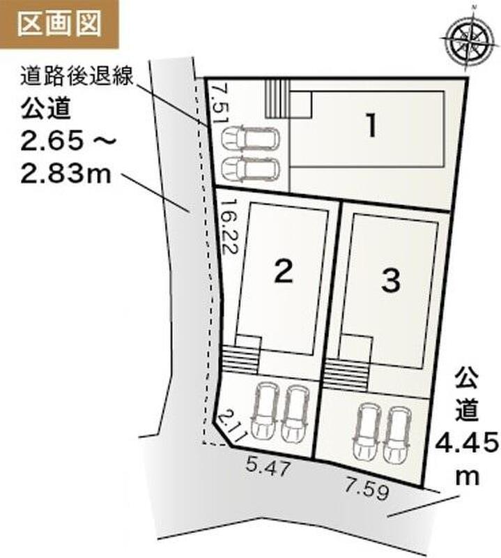 | 駐車場 | 2台 | 道路の幅員 | 道路幅:2.6m・4.4m、アスファルト舗装、西側約2.65~2.83m公道 南側約4.45m公道 |