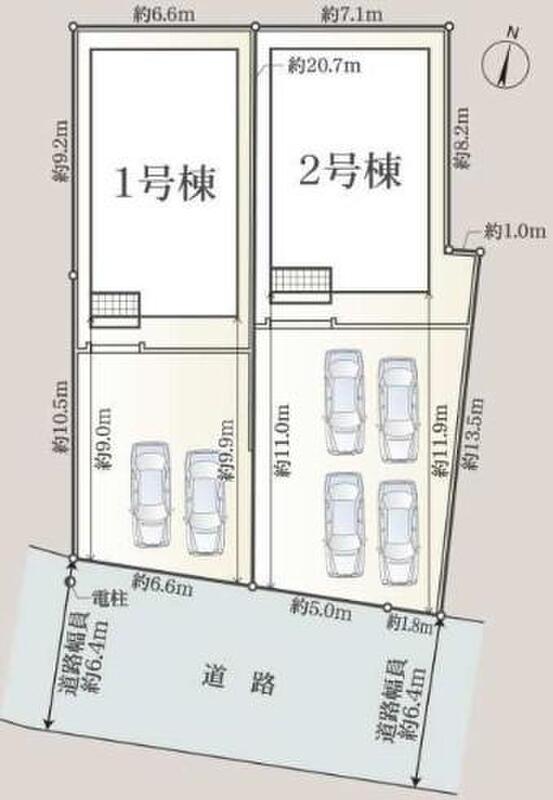 | 駐車場 | 2台 ~ 4台(1号棟(2台)・2号棟(4台)) | 道路の幅員 | 道路幅:6.4m、アスファルト舗装、南側 約6.45m 公道 |