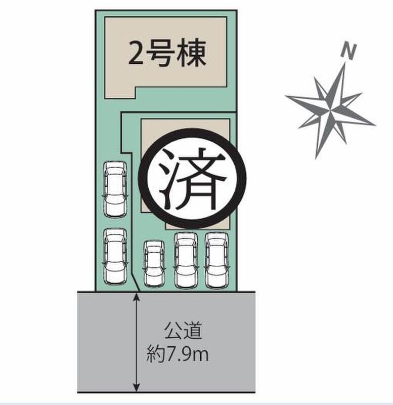 | 駐車場 | 2台 | 道路の幅員 | 道路幅:7.9m、アスファルト舗装、南側 約7.9m 公道 |