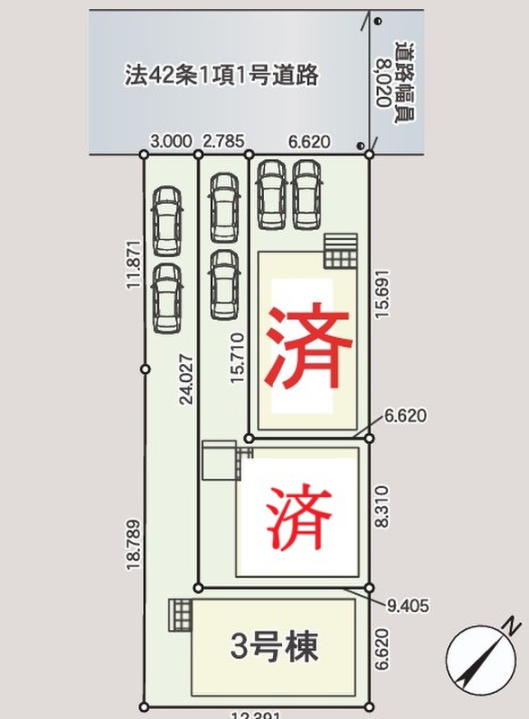 | 駐車場 | 2台 | 道路の幅員 | 道路幅:8m、アスファルト舗装、北西側約8.02m公道 |