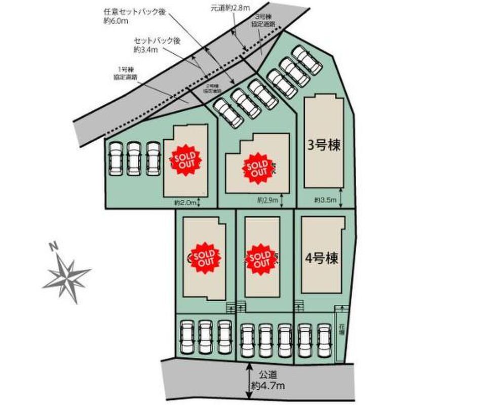 | 駐車場 | 2台 ~ 3台(2台(4号棟)、3台(3号棟)) | 道路の幅員 | 道路幅:2.8m・4.7m、アスファルト舗装、北側約2.8m公道 南側約4.7m |