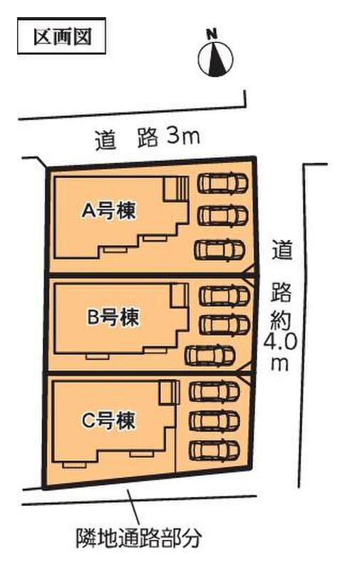 | 駐車場 | 3台 | 道路の幅員 | 道路幅:3m・4m、アスファルト舗装、北側約3m公道 東側約4m公道 |