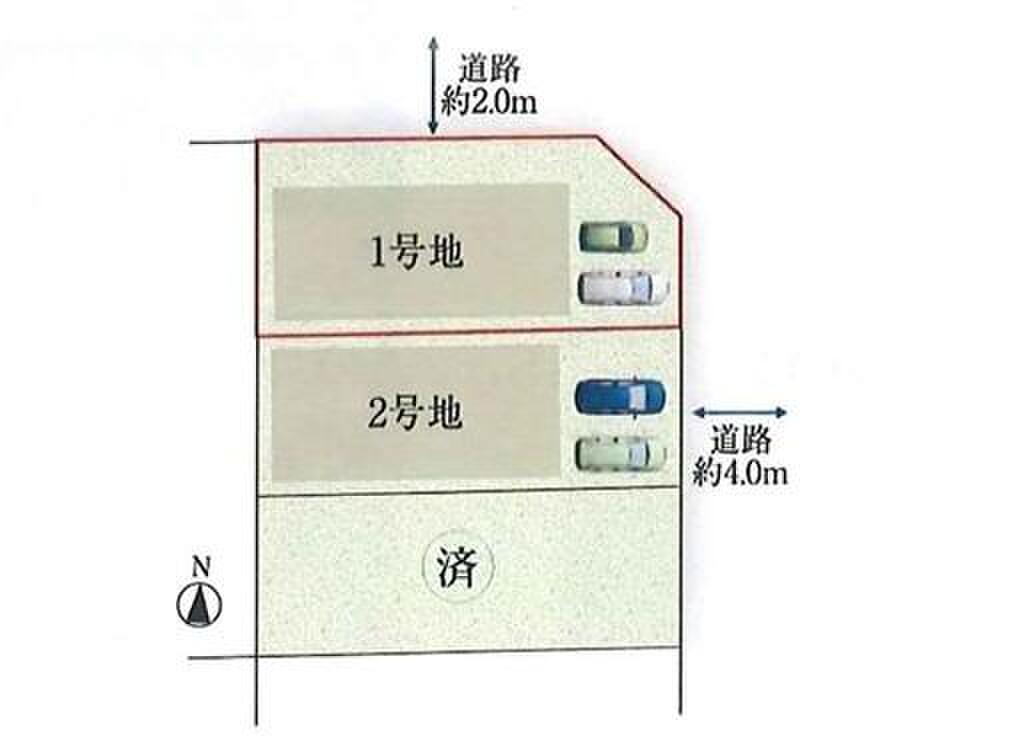 | 駐車場 | 2台 | 道路の幅員 | 道路幅:2m・4m、アスファルト舗装、北側2.0m公道、東側4.0m公道 |