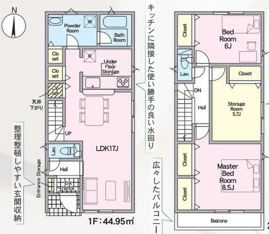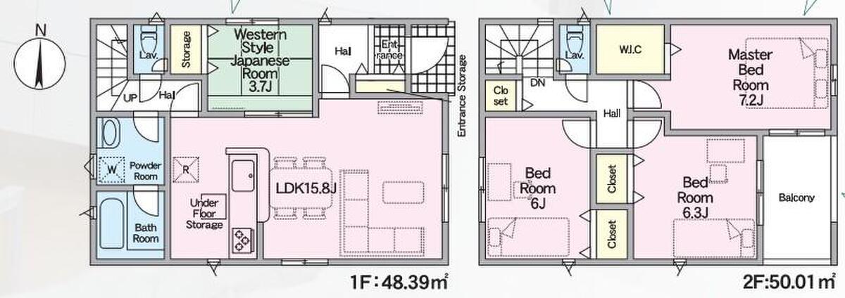 | 建物面積 | 91.52m2・98.4m2(27.68坪・29.76坪) | 土地面積 | 100.1m2・170.3m2(30.28坪・51.51坪) |
