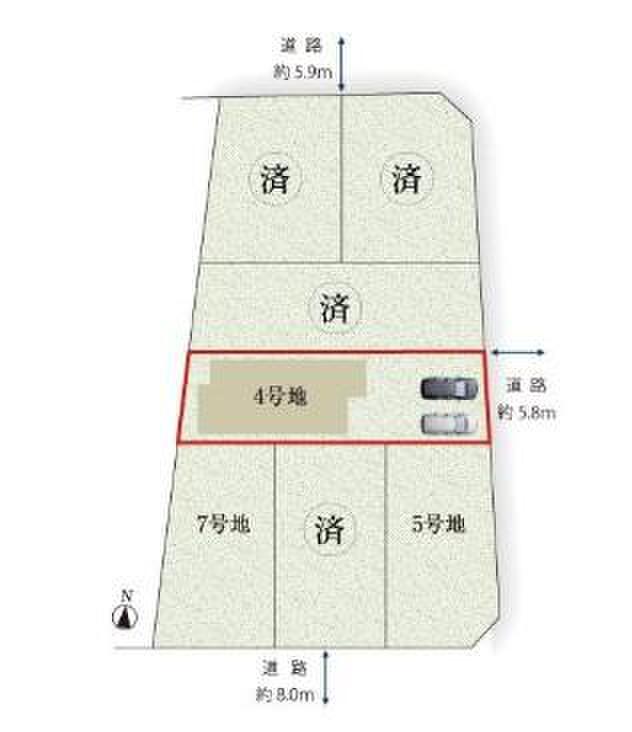 | 駐車場 | 2台 | 道路の幅員 | 道路幅:5.9m、アスファルト舗装、東側 約5.9m 公道 |