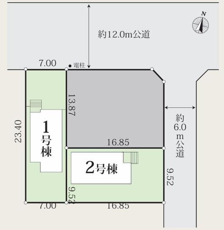 | 駐車場 | 2台 | 道路の幅員 | 道路幅:6m・12m、アスファルト舗装、東側約6m公道 北側約12m公道 |