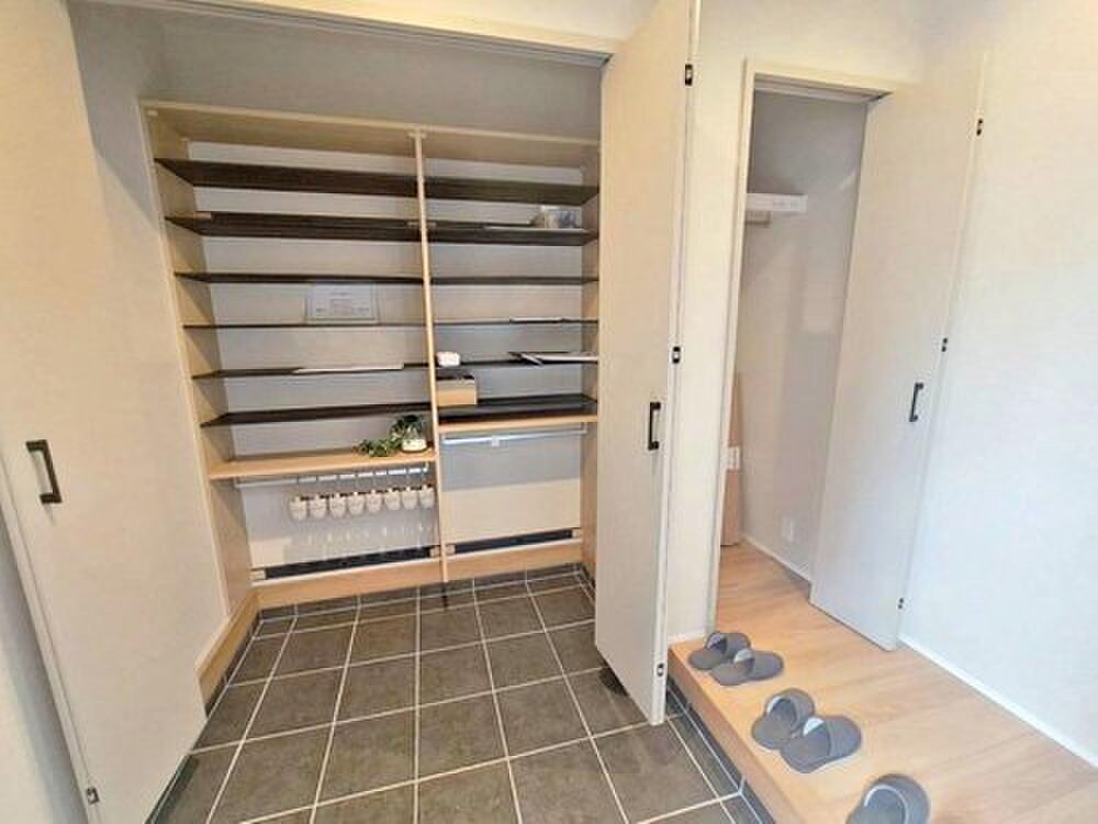 ご家族分の靴がたっぷり収納出来るので、玄関が片付きスッキリした印象に!廊下収納も、帰宅時のコートを掛けたりできるので、生活する上で大活躍です。