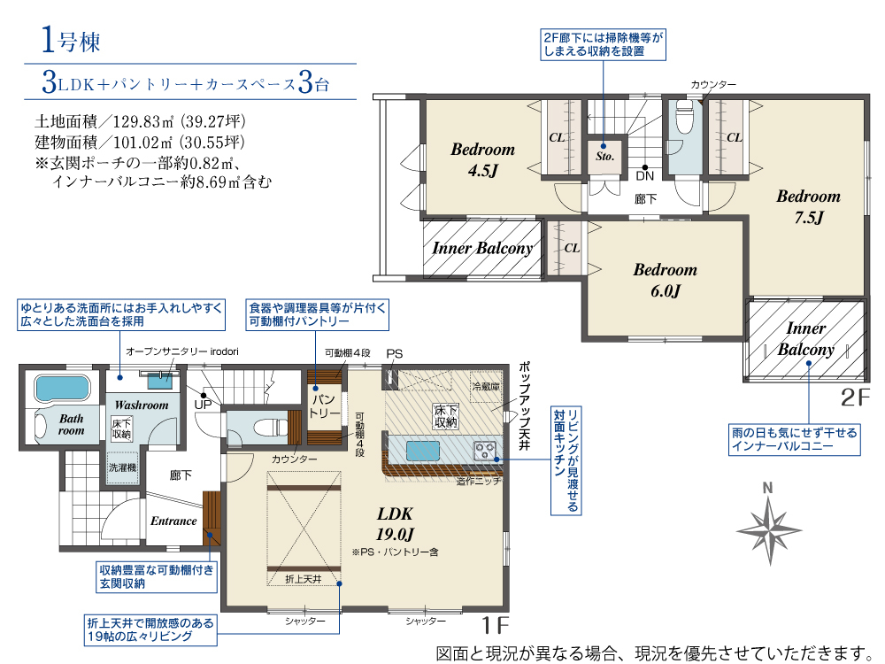 | 建物面積 | 100.14m2(約30.29坪)~105.57m2(約31.93坪) | 土地面積 | 129.83m2(約39.27坪)~148.92m2(約45.04坪) |