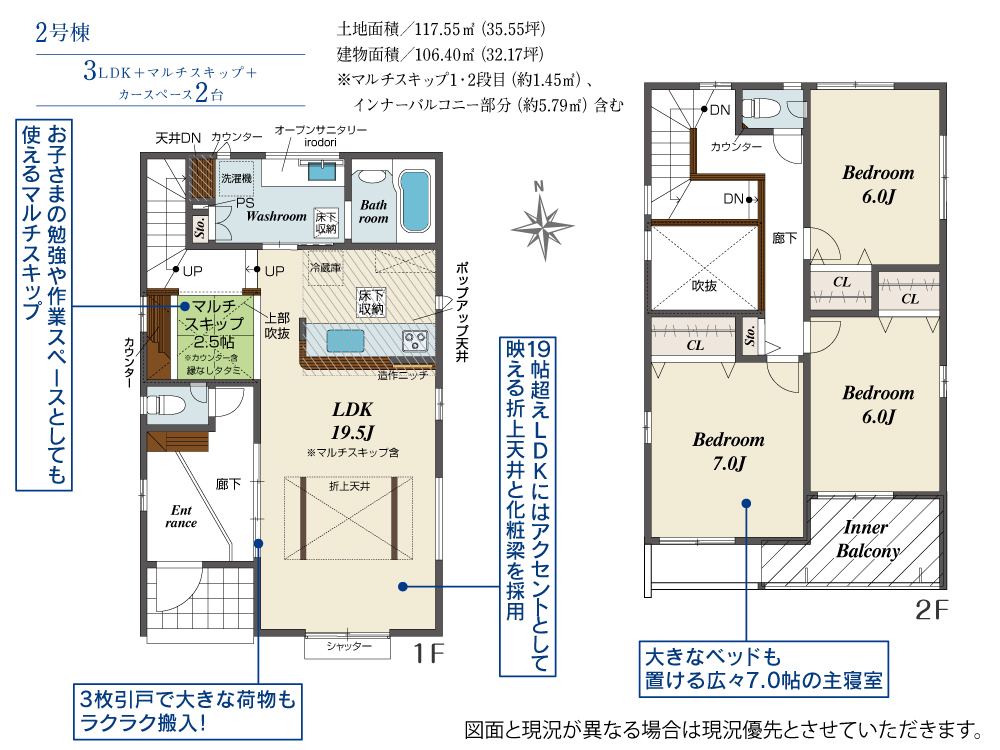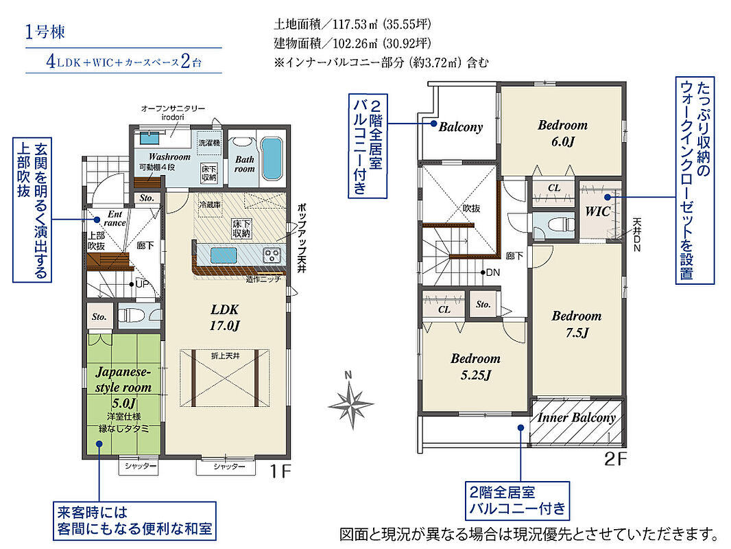 | 建物面積 | 102.26m2(約30.93坪)~112.19m2(約33.93坪) | 土地面積 | 117.53m2(約35.55坪)~117.55m2(約35.55坪) |