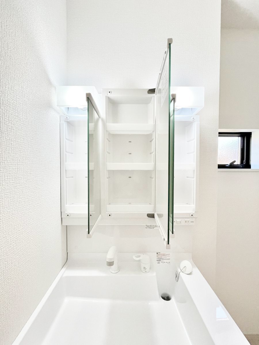 三面鏡の裏に、化粧品や衛生用品などを収納...