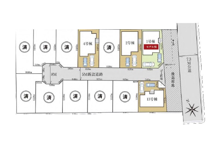 | 駐車場 | 2台 | 道路の幅員 | 4号棟:南西5m /2号棟:南西5m /13号棟:南東13.3m 北東5m /1号棟:南東13.2m 南西5m |