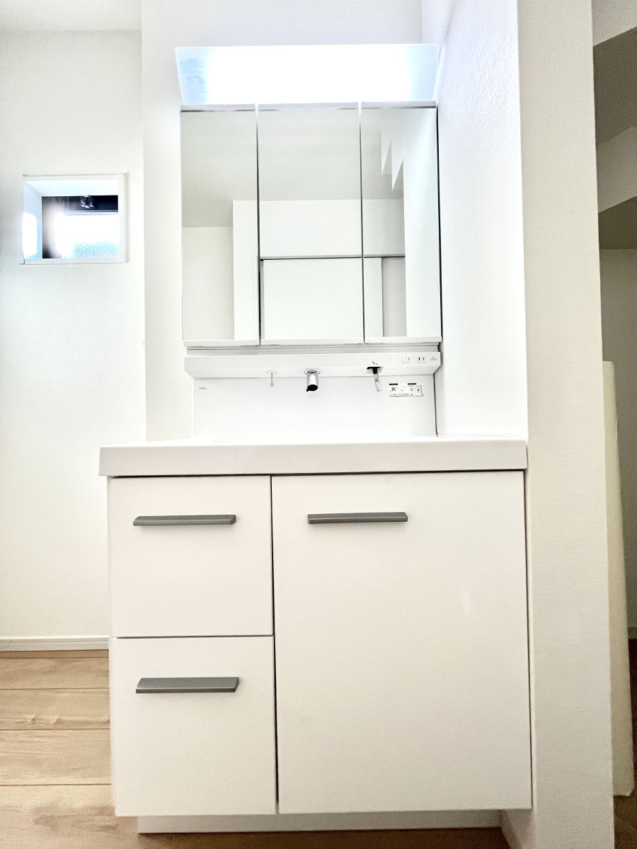 三面鏡の裏に、化粧品や衛生用品などを収納...
