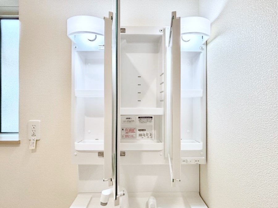 三面鏡の裏に、化粧品や衛生用品などを収納...