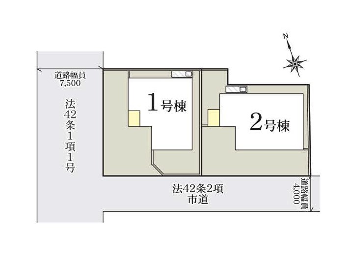 | 駐車場 | 2台 | 道路の幅員 | 1号棟:西7.2m 南3.6m |