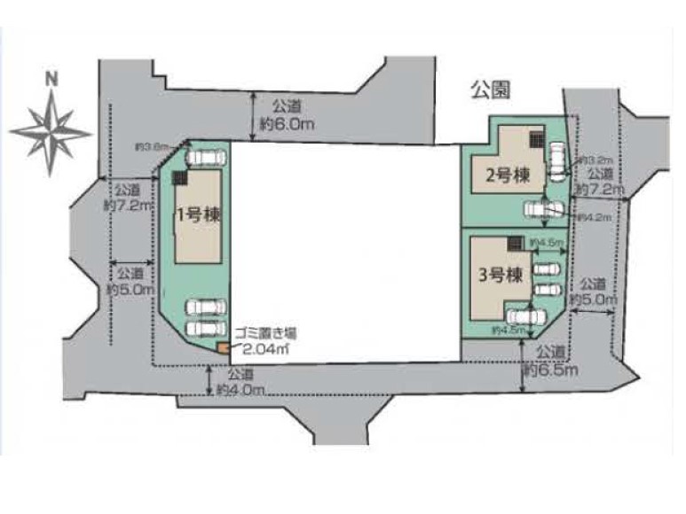 | 駐車場 | 2台 ~ 3台 | 道路の幅員 | 3号棟:南6.5m 東5.8m /1号棟:北6m 西5.7m 南4m /2号棟:東5.8m |
