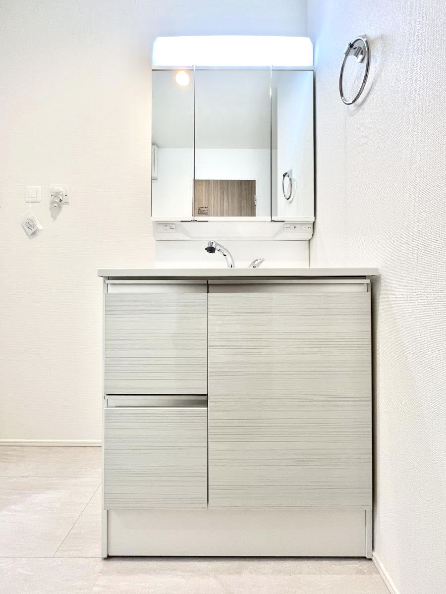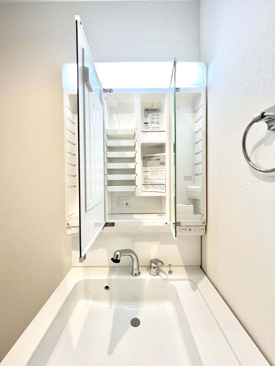三面鏡の裏に、化粧品や衛生用品などを収納...