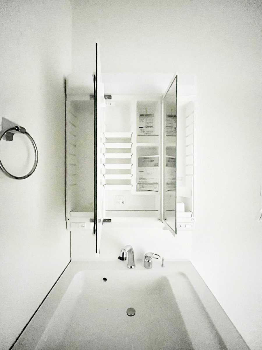三面鏡の裏に、化粧品や衛生用品などを収納...