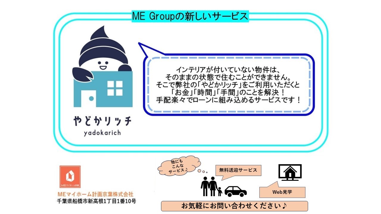 MEマイホーム計画京葉へお問合せ頂きましたお客様の特典 ★送迎サービス★ MEマイホーム計画京葉の取り扱いエリアは広範囲に渡って行っております。 交通費やガソリン代がかかってしまう・・・そんな悩みもMEマイホーム計画京葉ではご自宅や 勤務先、ご指定の場所までスタッフがお迎えに上がります。 小さなお子様をお連れのお客様にはチャイルドシートのご準備もございますのでご遠 慮なくお申し付けくださいませ。 是非、無料送迎サービスをご利用下さいませ。 ★住宅ローンのご相談★ MEマイホーム計画京葉では30行以上の銀行との取引があります。 都市銀行・地方銀行・信用金庫・フラット35等、お客様のライフプランにあった住宅 ローンのご提案をさせて頂けます。 自分達がどのくらい住宅ローンを組めるのか?また、月々の支払はどの程度なら難な く支払っていく事が出来るのか? 資金計画を細かくご説明させていただきます。 当然ご相談は無料ですので、スタッフにお申し付け下さいませ。 ★金利優遇★ MEグループは金融機関から「A(優良企業)」と評価されています。 財務基盤が強固な事は不動産企業を見定める上で、実は最も重要な事です。 お客様に対し余裕を持った対応が可能となり、安心と信用をご提供出来ます。 金利優遇も案件数が多い為、通常個人で持ち込んで審査を出すよりも金利優遇を有利 な条件で受けられご利用出来ます。 ★ファイナンシャルプランナー無料相談★ 自分達が今、お家を買っても問題ないのか?もうちょっと資金を貯めてから購入した 方が良いのか? また自分達の年収からどの程度の金額の物件を購入する事がいいのか? 老後にかかるお金はいくらなのか?家族構成や趣味、旅行に行く頻度等、これは人に よってそれぞれです。 詳しくお話をお伺いしながらファイナンシャルプランナーが無料でご相談を承りま す。 要予約制になっておりますのでご希望のお客様はご遠慮なく担当スタッフまでお申し 付け下さいませ。 ★引越業者提携サービス★ 弊社では大手引越企業と業務提携を行っております。 通常の見積もりよりも割引を受けられ、お安く引越をする事が可能です。 少しでも安く済ませたいのは誰でも同じです。 是非、ご利用ください。 ★リフォーム相談★ 中古物件を購入されるお客様はもちろん中を気持ちよく使いたい。 しかしながらリフォームって結構お金かかるし・・・と悩みの相談を多々受けます。 MEグループではグループ内にオプション会社・リフォーム会社もございますので安 心して任せられます。 全て、MEグループでお家の事はまかなえます。 お気軽にお問い合わせください。 |