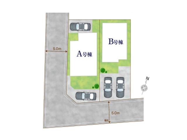 | 駐車場 | 2台 | 道路の幅員 | A号棟:西5m 南5m |