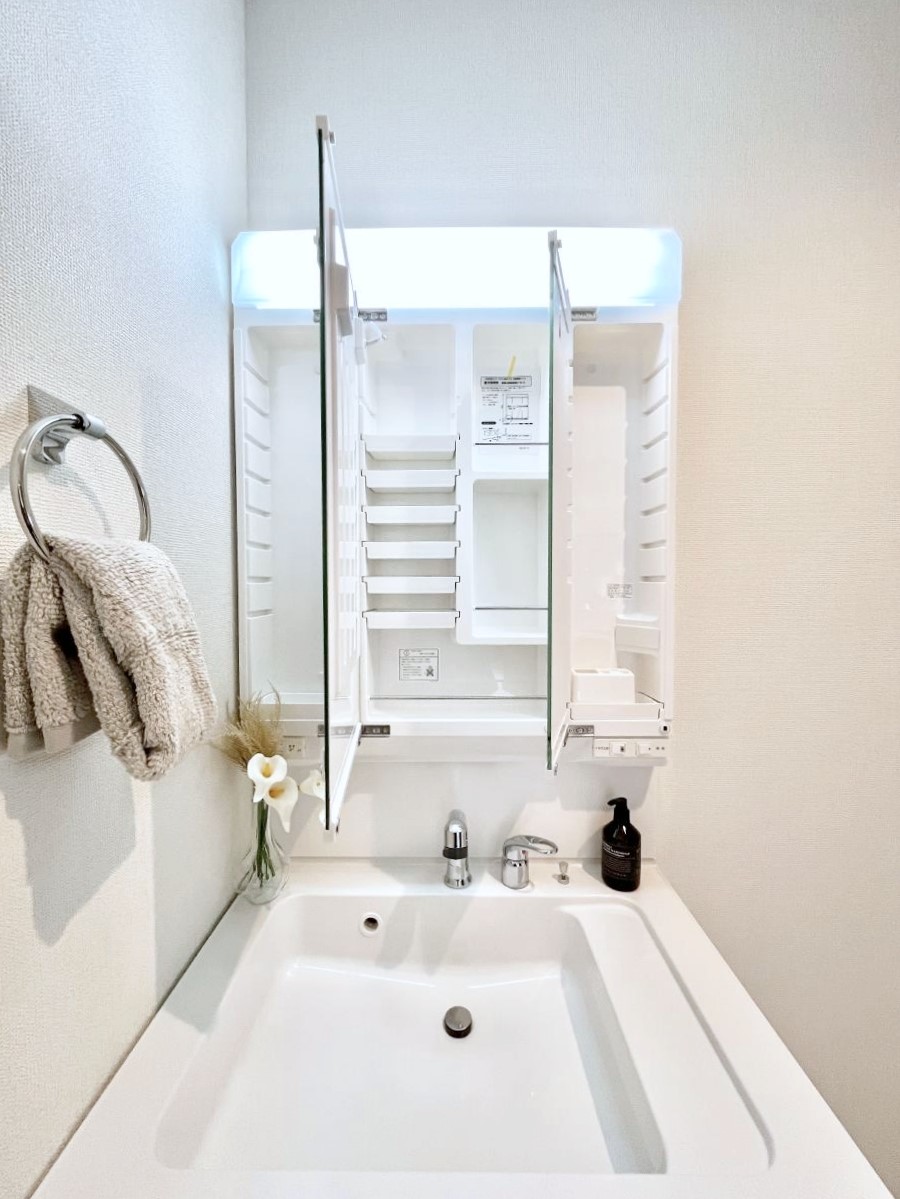 三面鏡の裏に、化粧品や衛生用品などを収納...
