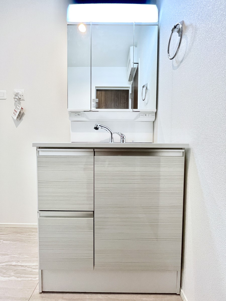 三面鏡の裏に、化粧品や衛生用品などを収納...