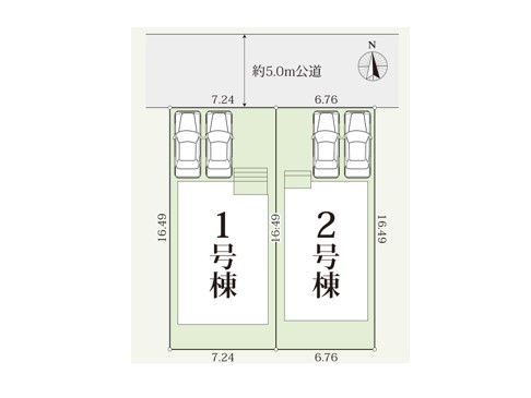 | 駐車場 | 2台 | 道路の幅員 | 1号棟:北5m /2号棟:北5m |