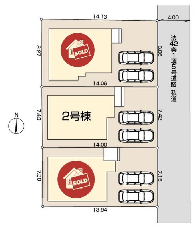 | 駐車場 | 2台 | 道路の幅員 | 道路幅:4m、アスファルト舗装、東側4.0m私道 |