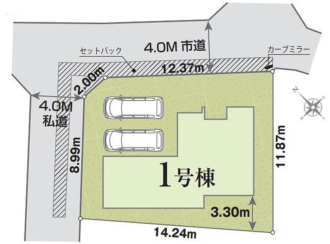 | 駐車場 | 2台 | 道路の幅員 | 道路幅:4m、アスファルト舗装、北東側4m市道・北西側4m私道 |