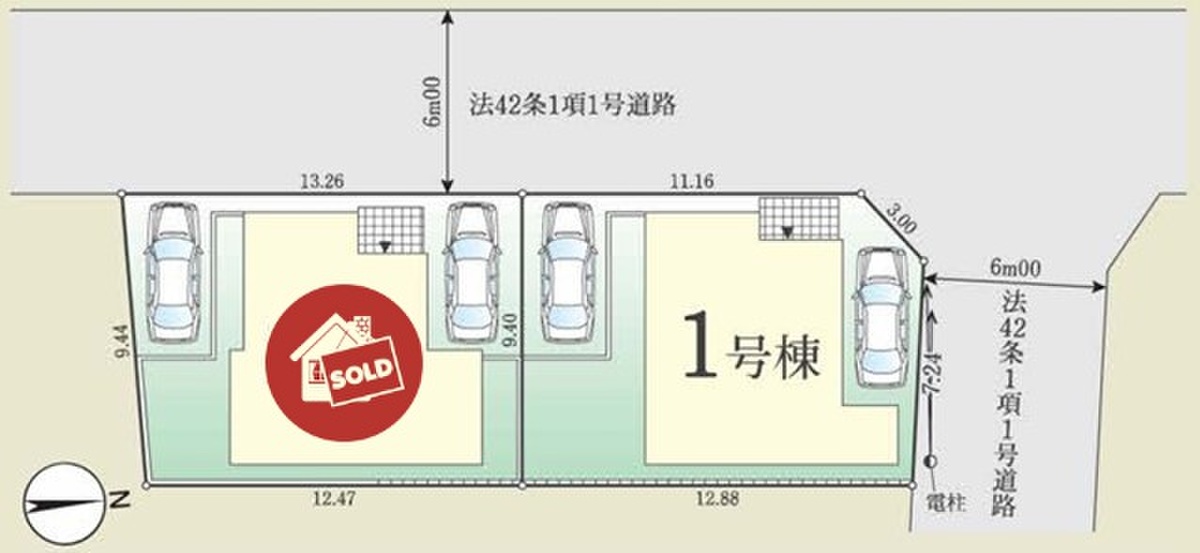 | 駐車場 | 2台 | 道路の幅員 | 道路幅:6m、アスファルト舗装、角地 : 北側 6m 公道、西側 6m 公道 |